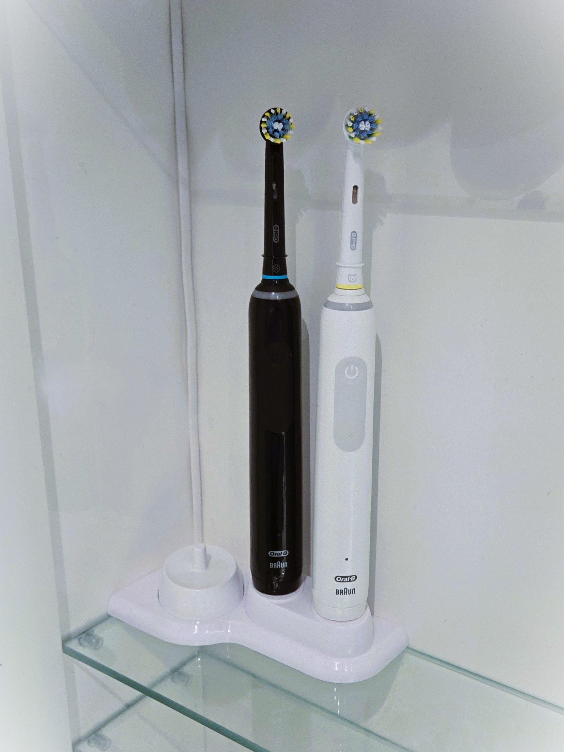 For 2 stk Oral B elektriske tannbørster + lader. Til å montere i baderomsskap.