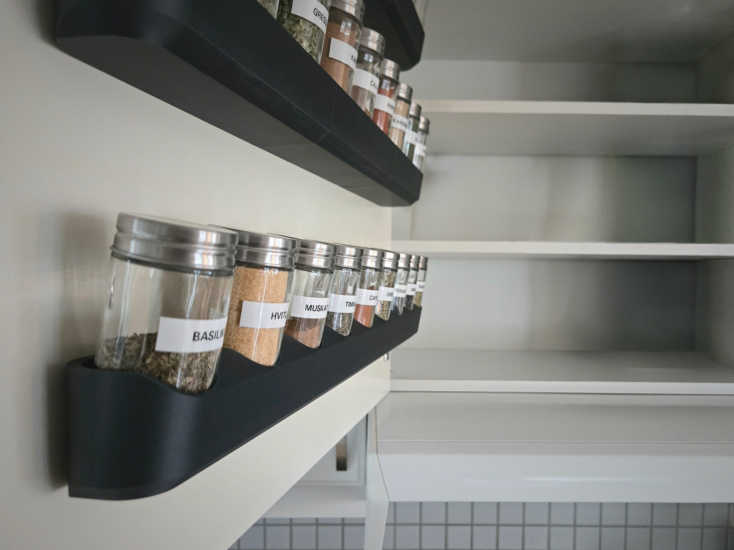 Krydderhylle for Clas Ohlson krydderglass. Hyllen er modulær og settes sammen av deler á 3 glass.